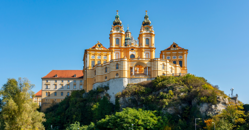 Temos também a Abadia de Melk, um dos mosteiros beneditinos mais imponentes da Europa, com vista para o Danúbio. É Patrimônio Mundial da UNESCO e parada obrigatória para quem percorre o trecho Viena–Passau. Seu interior dourado e sua biblioteca são de tirar o fôlego!